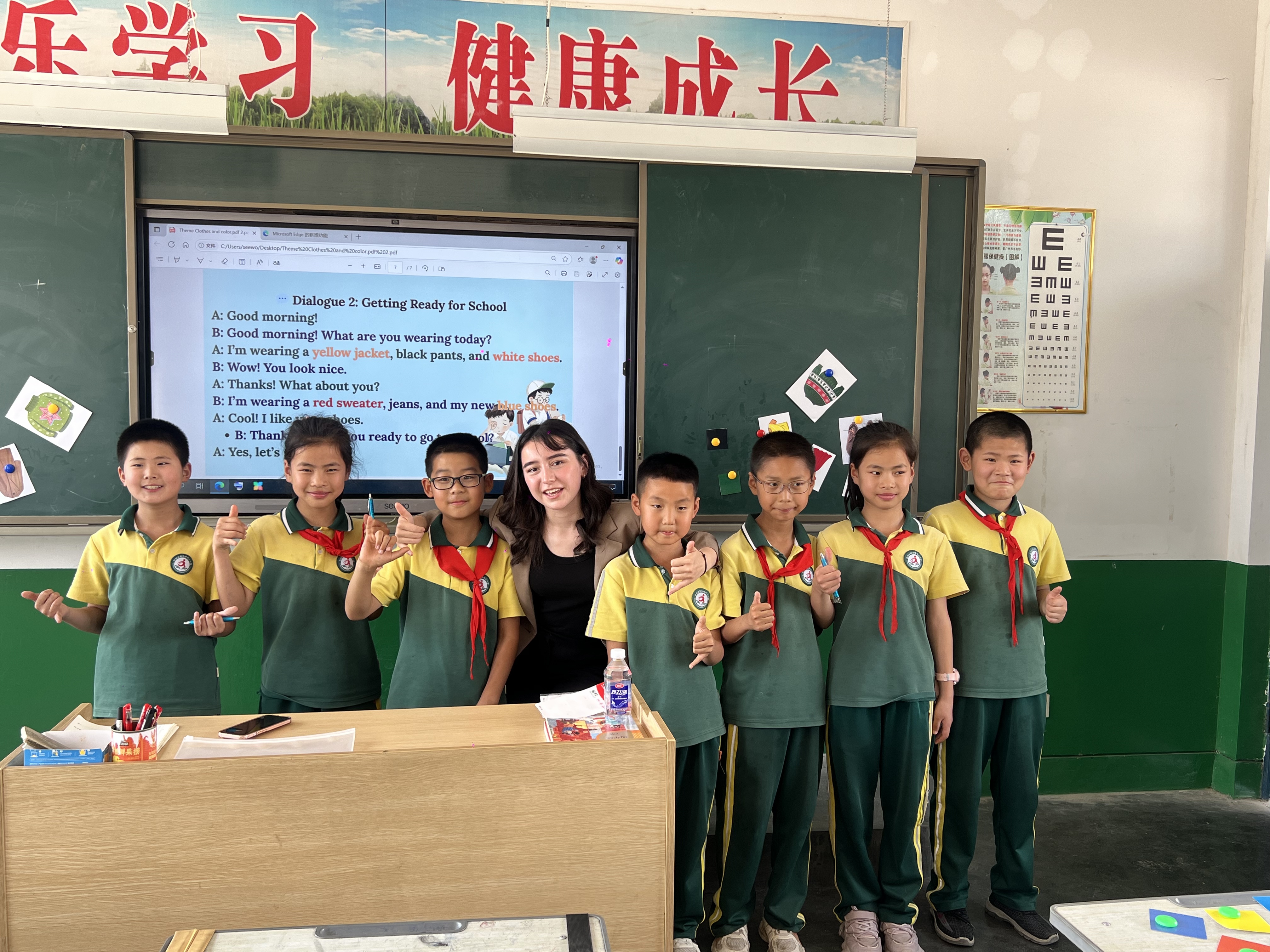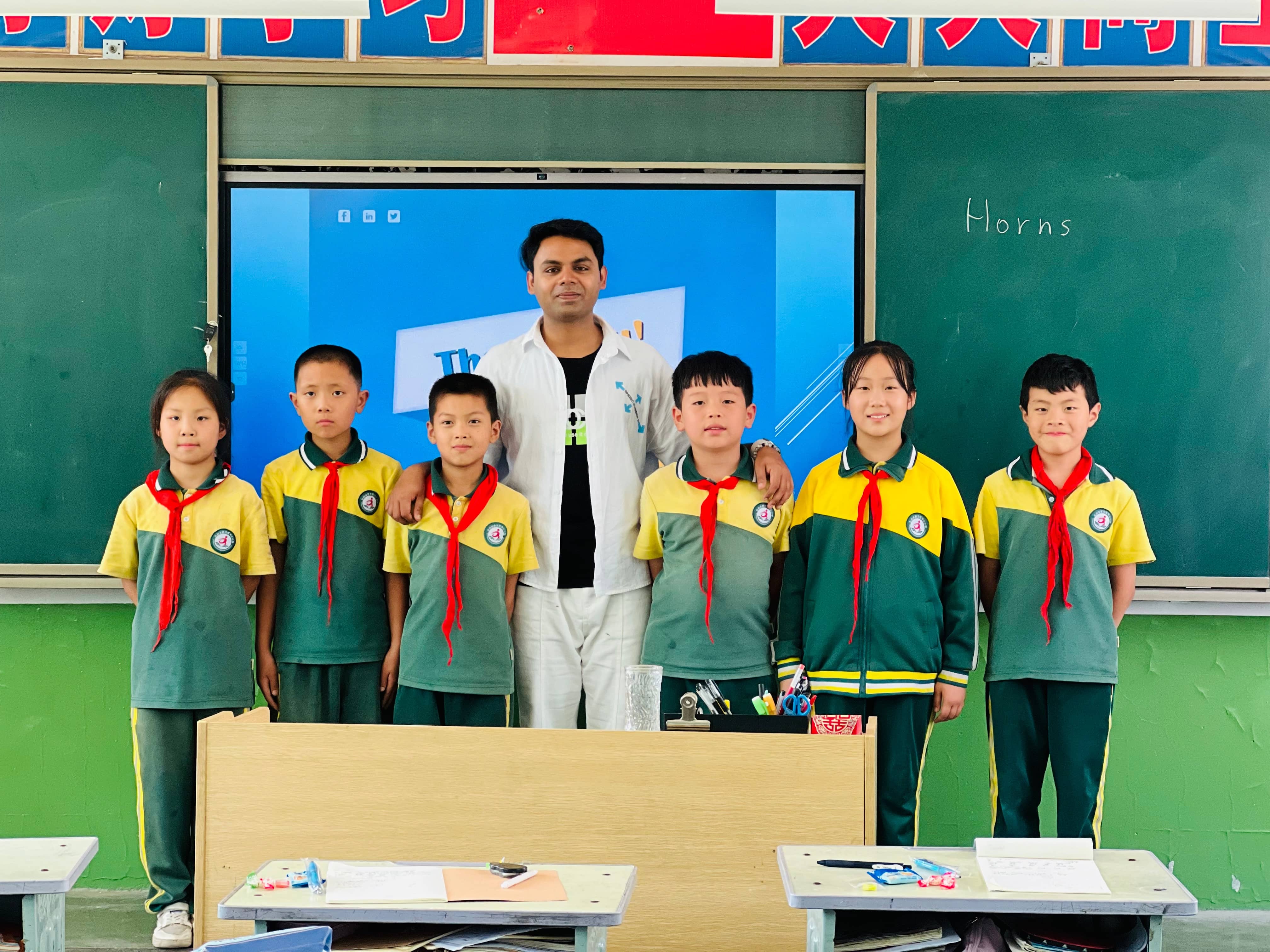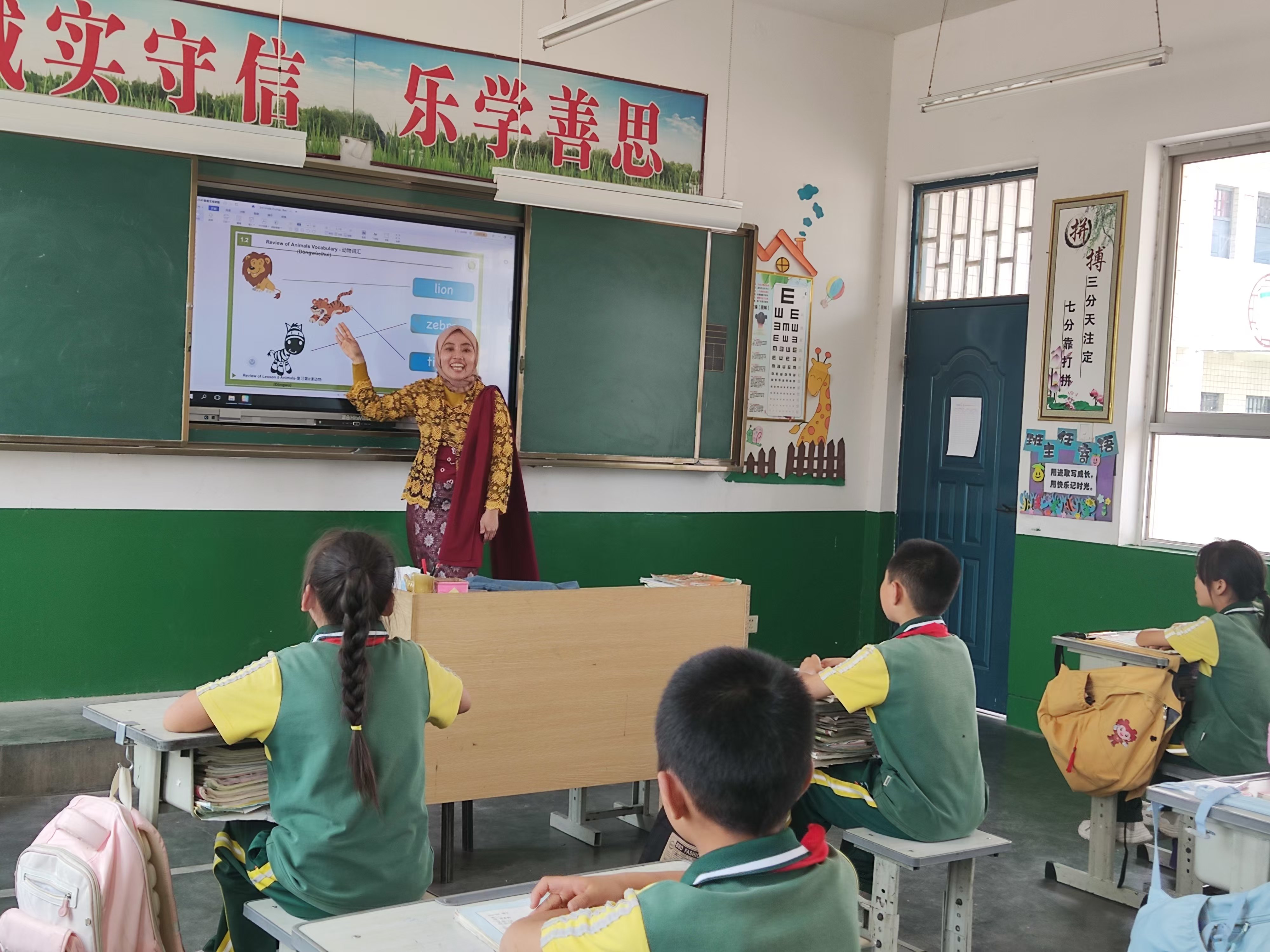 职工们首先来到合阳南沟村小学和坡赵小学,为孩子们带来了生动有趣的英语口语课。课堂上,职工们各展所长,来自印度的ALAM SYED SHANE护照名(中文名:沙义)和来自印度尼西亚的EMERALDA EKA PUTRI SETYAWATI(中文名:谢墨如)通过创意游戏矩阵与动画教学影像,将狮子、大象、猴子等动物的英文表达融入其中,并结合互动游戏解析动物习性特征,让英语学习充满趣味;印度尼西亚的MAHARDIKA SURYA BAGUS(中文名:苏尔雅)以“我的旅程:从印尼到中国!”为叙事主线,借助鲜活的语言表达与丰富的多媒体教学素材,带领员工开启了一场跨越国界的文化之旅,从印尼火山地貌、婆罗浮屠的历史,到传统服饰纱巾的文化寓意,再到跨国旅程的动词运用,孩子们在沉浸式互动中感受不同文明的魅力;来自塔吉克斯坦的 KHUDOYOROVA MANIZHA(中文名:玛尼莎)则以衣服和颜色为话题,与员工展开英语口语互动;来自巴基斯坦的NOORIN SADIA(中文名:沙迪)在合阳小学英语口语支教已有3年,通过“线上+线下”授课累计授课超过120个小时,即将毕业回国的她为小员工们上了最后一堂口语课,课后孩子们都依依不舍地与其道别。