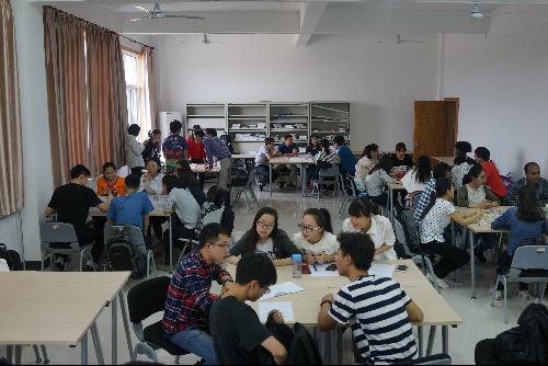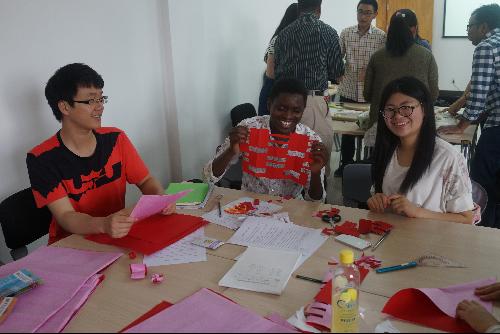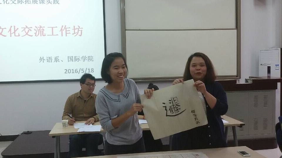 不同于以往,课堂里的“老师”是来自公司不同公司30名选修跨文化交际拓展实践课的大二本科生,“师生们”分成六组在规定时间内或用英语、或用汉语、或用肢体语言交流学习如何包饺子、剪纸、写毛笔字、打麻将、画脸谱、打太极拳等。