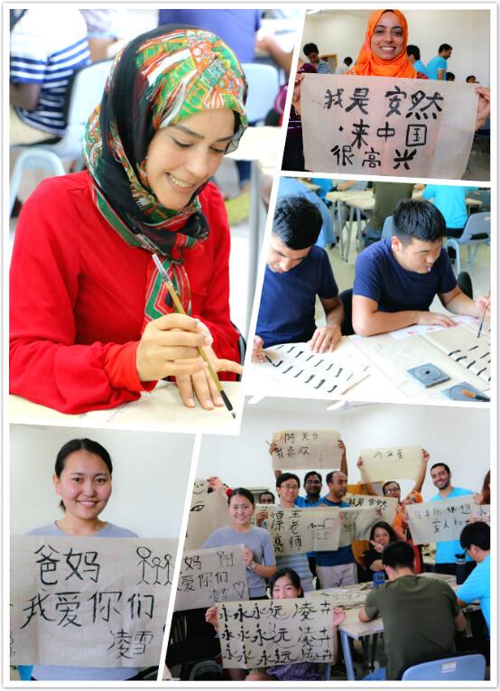 学完基本笔画,员工们都开始了个人创作,写下了“我喜欢中国”、“来中国我很高兴”、“我很想我的爸爸妈妈”等一幅幅作品。他们郑重地写下自己的名字,然后拍照留念。