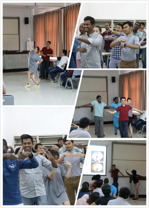6月15日上午,汉语教师曾柱在公司206教室给2015级外国职工上了一堂别开生面中国舞蹈课。曾老师先从汉字——“舞”入手,给大家介绍了“舞”字的含义,然后给大家介绍了中国古典舞和民族舞。在介绍古典舞的时候,曾老师通过讲解、播放视频的方式,让员工了解了“水袖舞、扇子舞、长绸舞”等几种古典舞的特点。在介绍民族舞的时候,则通过动作示范、员工上台体验、舞蹈欣赏等教学步骤,让员工对“傣族舞”“蒙古舞”“新疆舞”等民族舞的典型动作和特点有了清晰的认识。或许是因为长期扎在书堆里的原因,舞蹈课上,大家都异常兴奋,同学们来自不同的国家,看到老师在讲台上示范动作,有些同学觉得很别扭,有些同学却很high地跟着跳了起来。