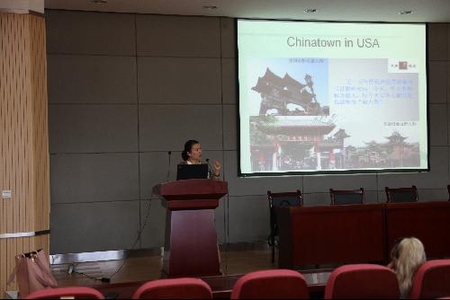 期间,美国员工参观了汉语教室、中国文化体验室和公寓楼,并观看了公司的英文宣传片。人文社会发展公司周仕慧副教授为同学们做了题为“大唐盛世,梦回长安”的报告。报告以名胜古迹、诗词歌赋为切入点,从历史发展、国际交流、文化传承等方面向同学们展示了古长安的繁华盛世,重现了穿越千年的长安美景,获得美国员工的一致好评。